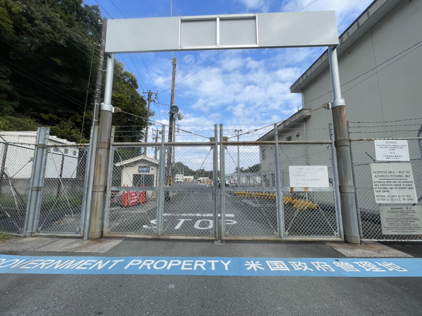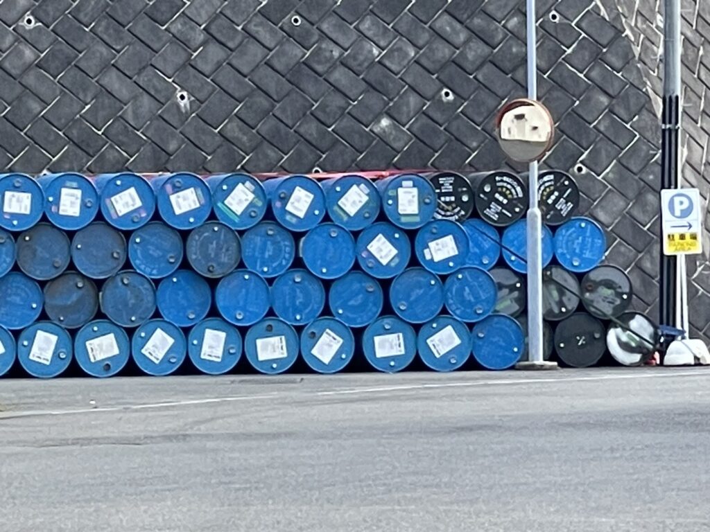 比与宇地区には海上自衛隊の「造修補給所」があり、中には青いドラム缶が横に積まれていた。