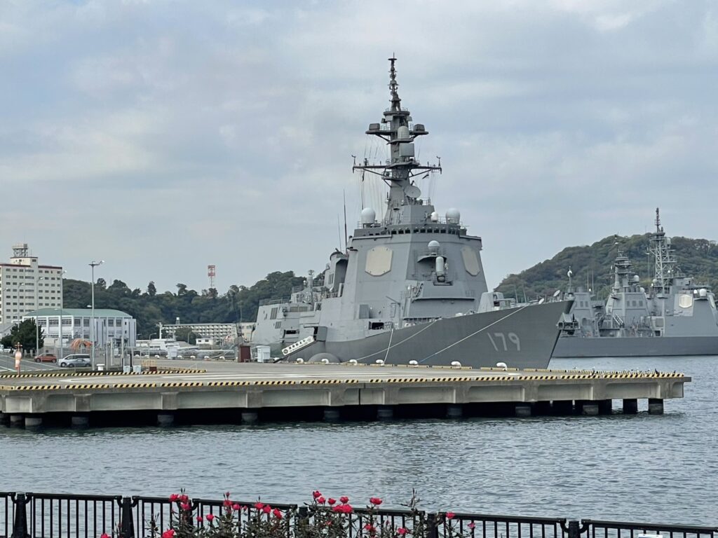 横須賀基地が日米軍事一体であることの象徴のようにすぐ近くにはイージス護衛艦「まや」が停泊。1680億円を投じて作られた「179」は日米共同開発の迎撃ミサイルとして初めて発射された艦船でもある。