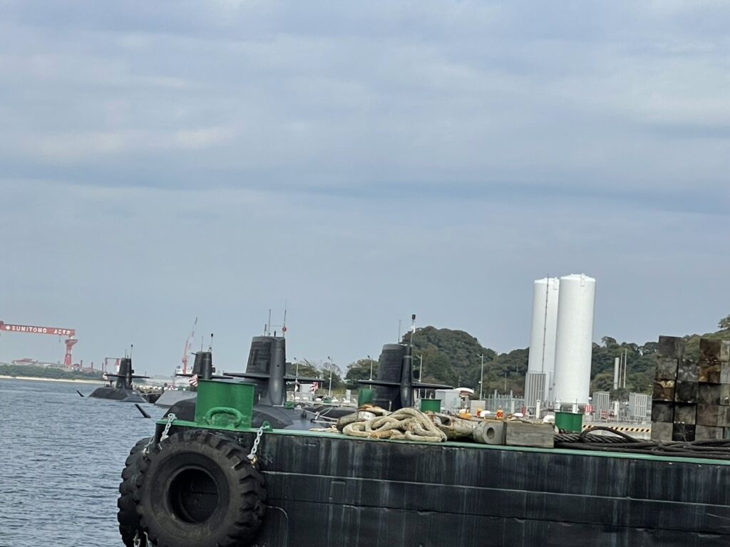 海水から黒い突起物を出した4隻の潜水艦、その前には潜水艦に注入する窒素と酸素の筒状タンク。この白いタンクの陸上よりの奥には潜水艦の乗組員の集合住宅もあった。同じ横須賀でありながら、全く違う異空間の場所だなあと感じた。