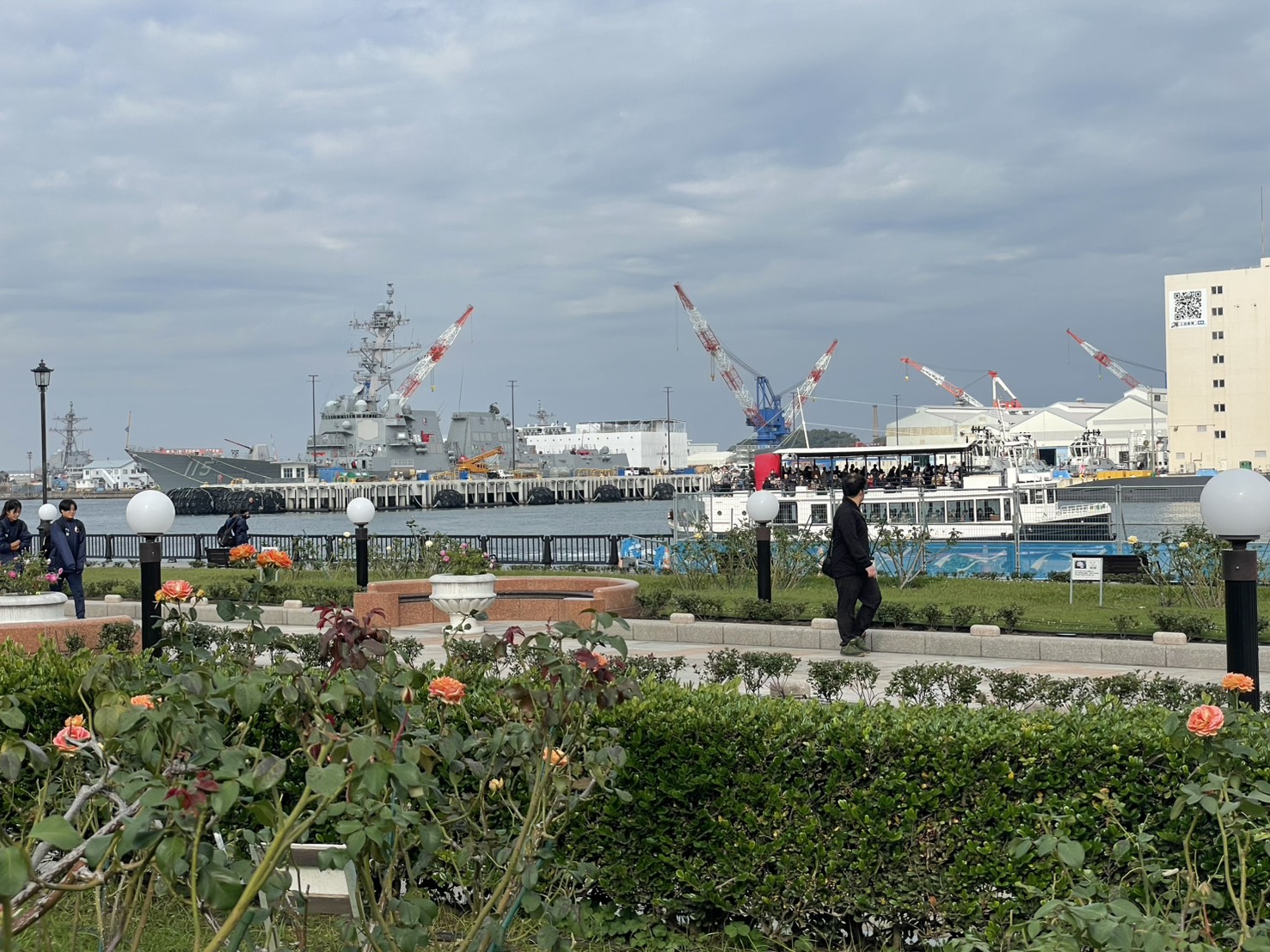 ヴェルニー公園では美しいバラが咲き誇る中、「軍港めぐり」の船がマッチ棒のようにぎゅう詰めのお客を乗せて米海軍ピア5の前を横切る。毎日変わる「展示物」。維持管理は自衛隊と米海軍、煎じ詰めれば日米政府と国民の税金。これを「遊覧船」で巡るとは。常々思うのだけど、こういう商いってどうなんでしょう?ぼろ過ぎると思いませんか。